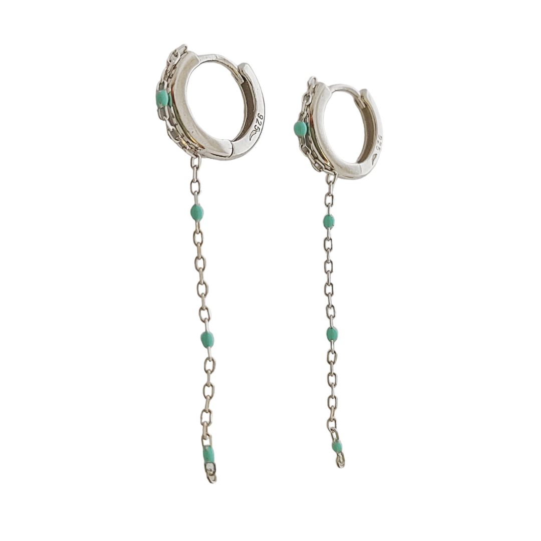 Brinco em prata 925 com corrente e pequenas bolinhas azuis