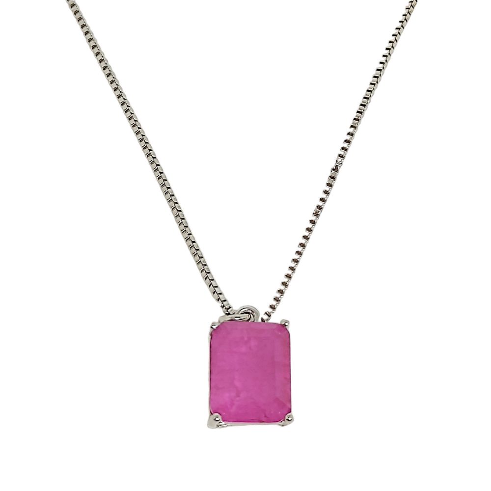 Colar em banho de ouro branco com pingente retângular de pedra fusion rosa magenta