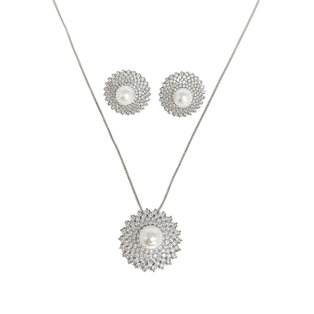 Conjunto colar e brincos em banho de ródio branco cravejado de zircônias com pérola shell
