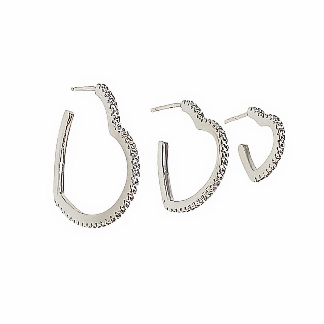 Trio de brincos banhados em ródio branco com corações vazados cravejados de zirconias