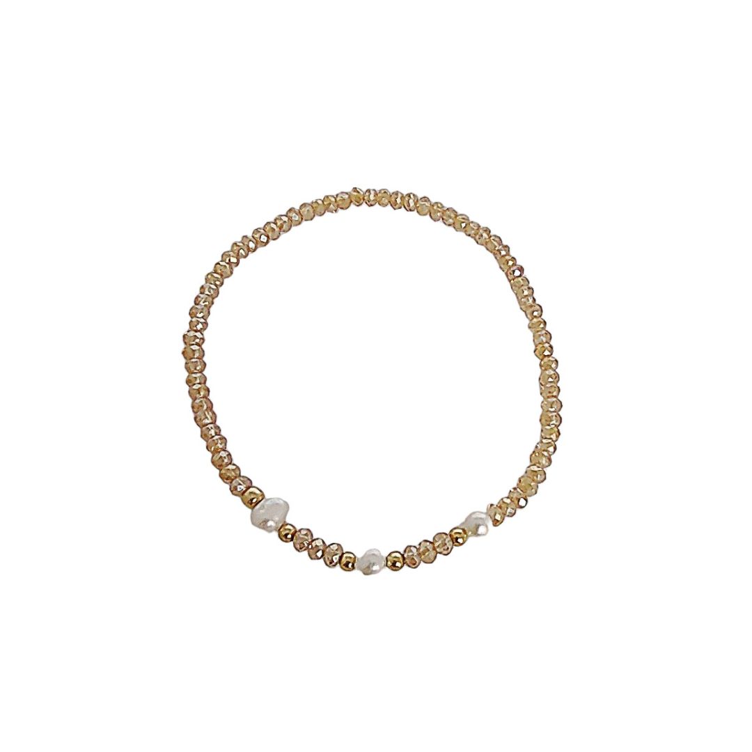 Pulseira elástica de cristais doce de leite com pérolas cultivadas e bolinhas em banho de ouro 18k